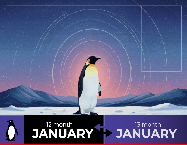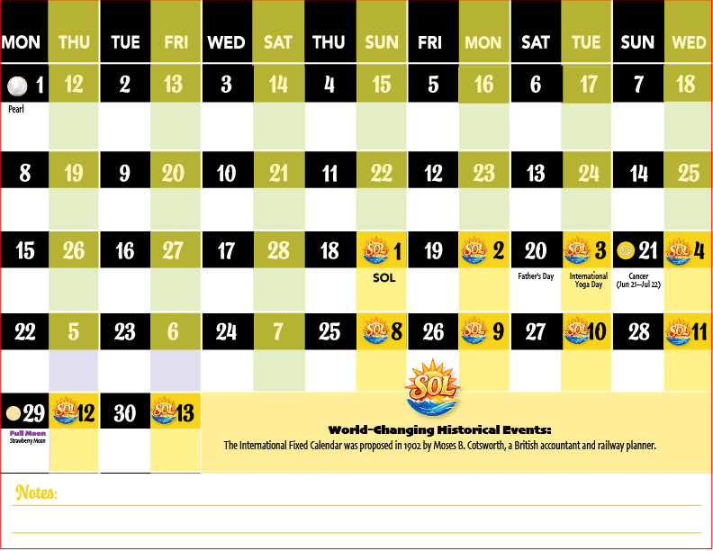 A 13-month calendar where each month contains exactly 28 days. Every date always falls on the same day of the week—year after year. This fixed structure is why it is called perpetual.